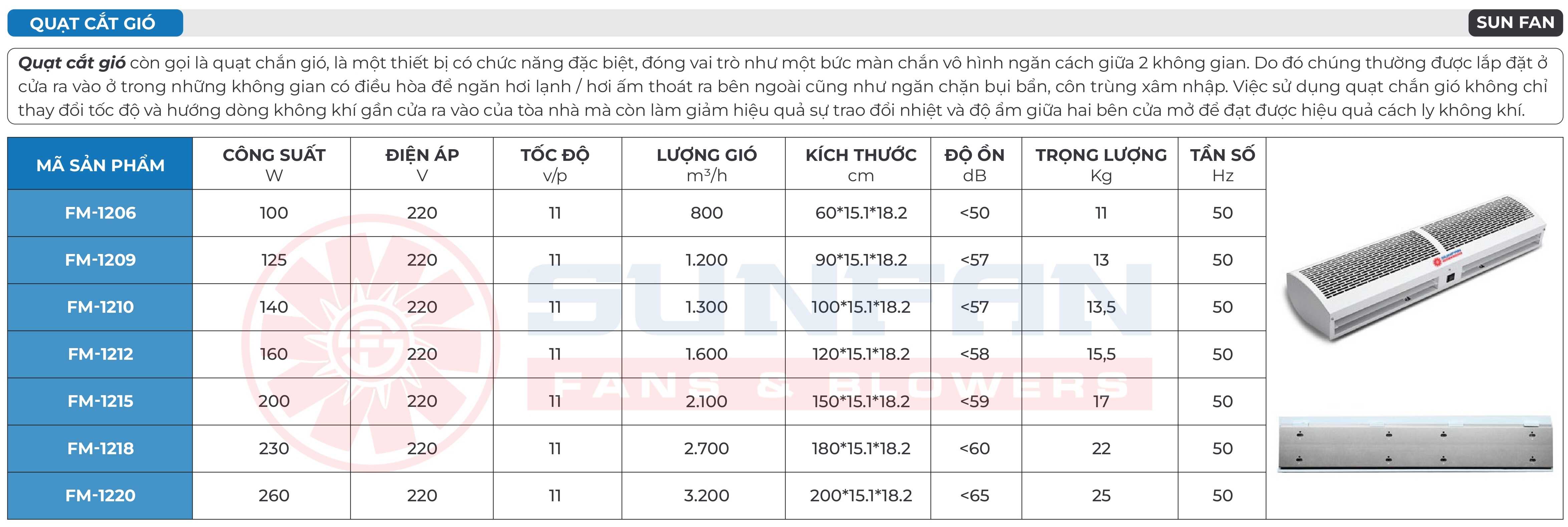 Quạt cắt gió SunFan FM-1220 là một loại quạt chắn gió chuyên dùng để cắt gió nhà hàng, siêu thi, văn phòng, nhà ở ... những nơi yêu cầu độ cao cắt thấp
