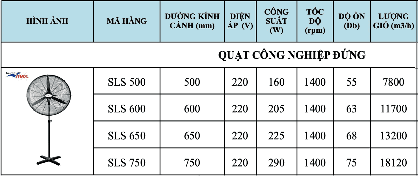 Thông số kỹ thuật quạt công nghiệp đứng Superlite Max SLS500
