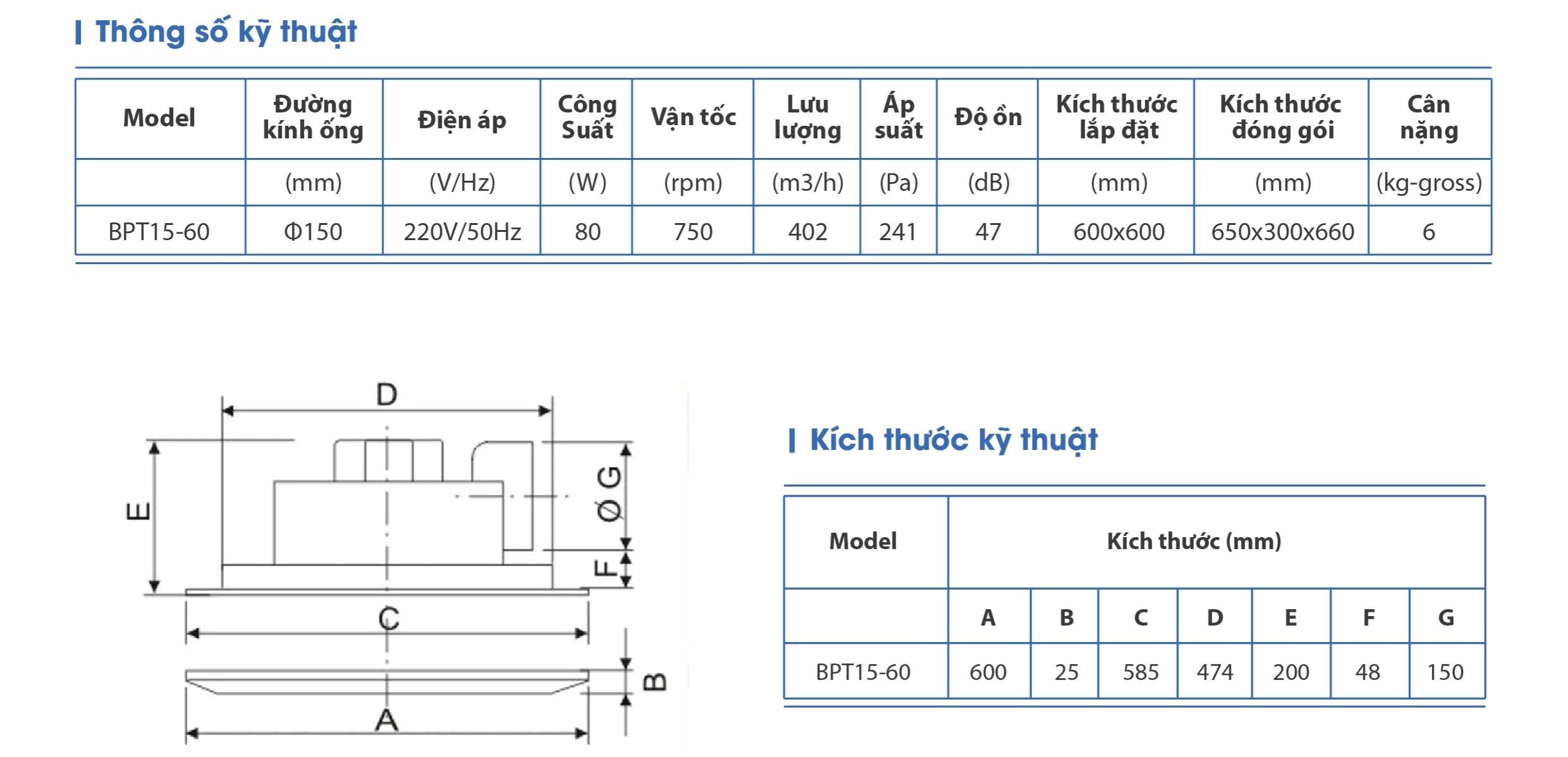 Thông số kỹ thuật quạt thông gió gắn trần 600x600 Nanyoo BPT15-60