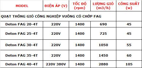 Quạt hút công nghiệp vuông Deton FAG có chớp là dòng quạt thông gió vuông gắn tường của Deton. Quạt sử dụng để thông gió trong các nhà máy, xưởng sản xuất, nhà kho, tầng hầm và các khu công nghiệp. Chức năng của quạt hút vuông công nghiệp là tạo ra luồng không khí lưu thông để đảm bảo không khí trong lành và an toàn cho người lao động.