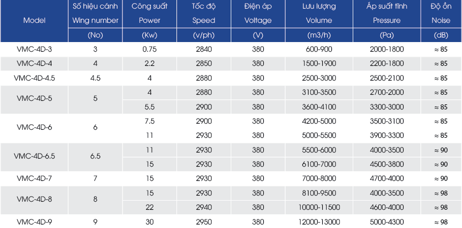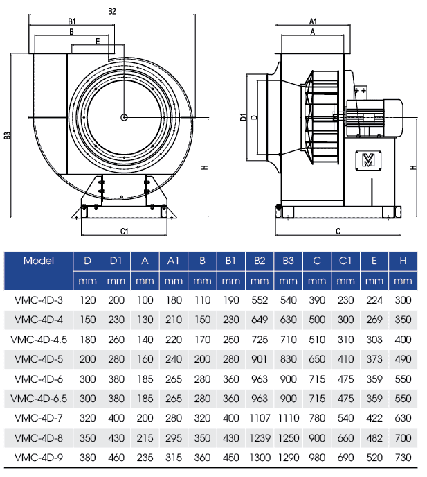 Quạt ly tâm cao áp trực tiếp VMC là dòng sản phẩm quạt thông gió ly tâm chuyên dùng cho các ứng dụng như cấp, hút khí cho các ngành công nghiệp như luyện kim, sản xuất kính, gạch, sản xuất điện, nhựa, hóa chất, khai thác mỏ…