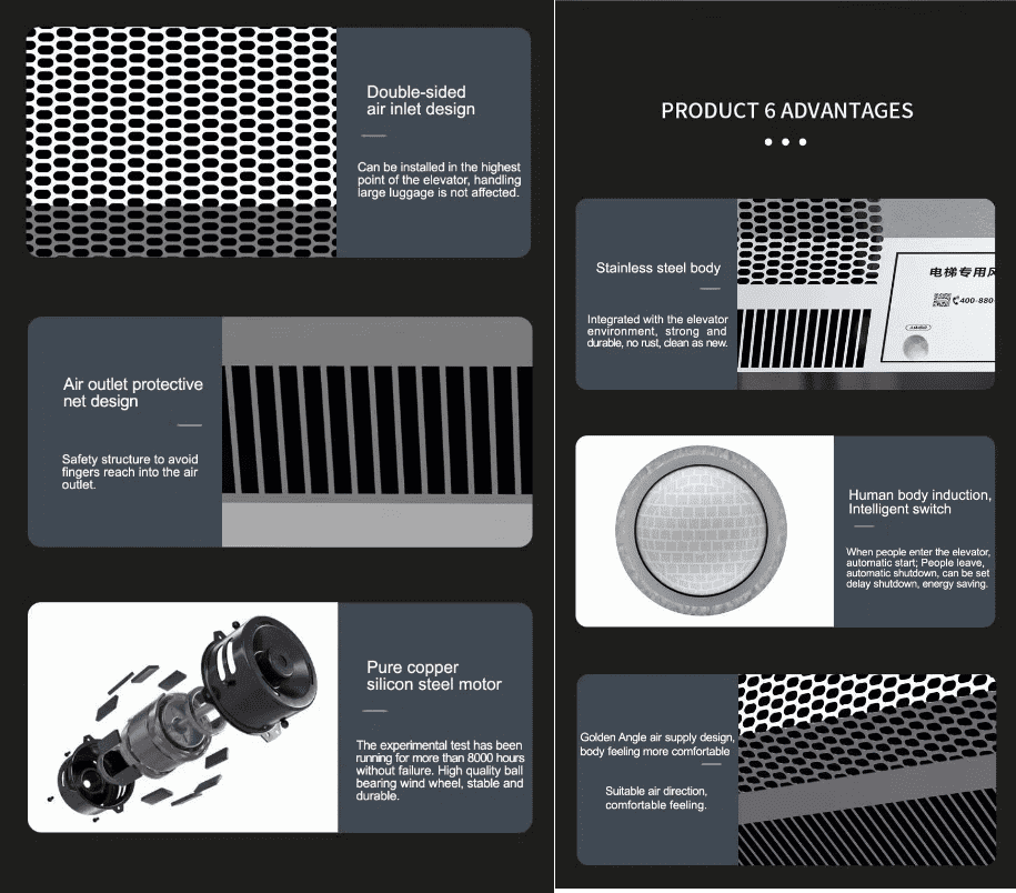 Thiết kế cửa hút gió hai mặt, có thể lắp đặt ở điểm cao nhất của thang máy, không ảnh hưởng đến việc xử lý hành lý lớn.