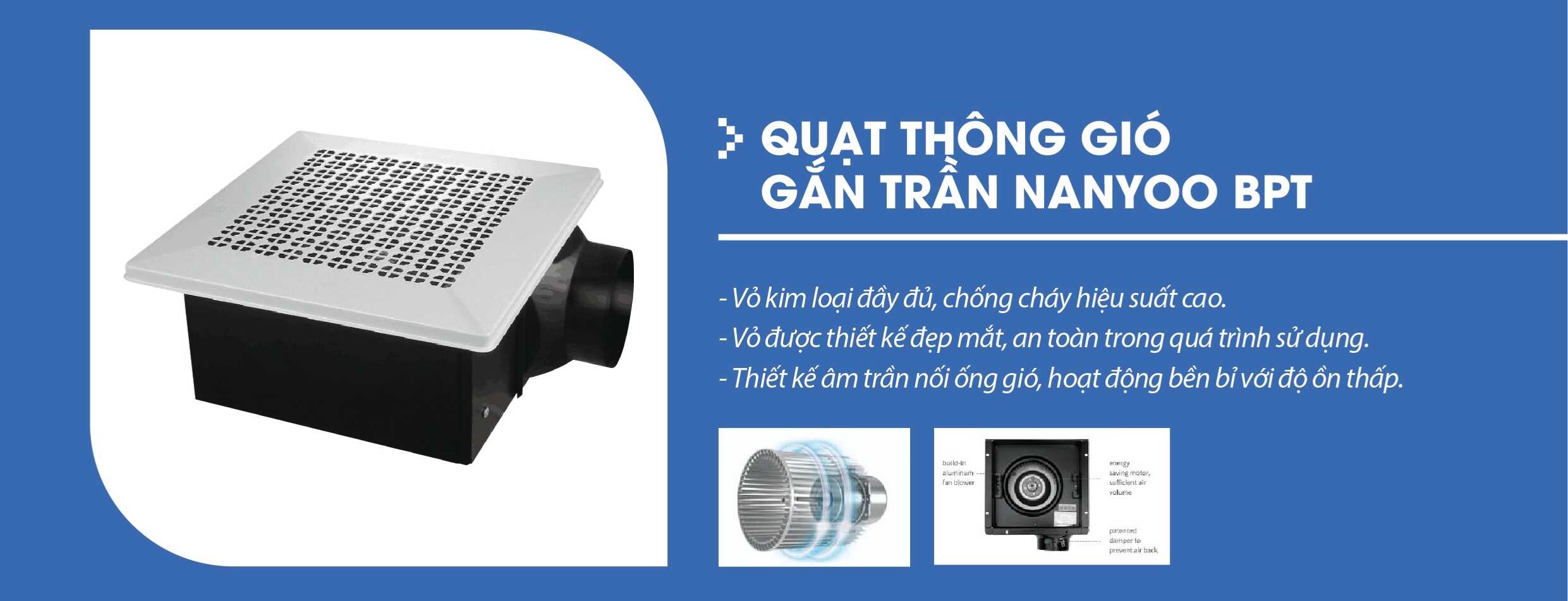 Quạt thông gió gắn trần Nanyoo BPT20-54A là dòng quạt hút âm trần cao cấp nhất của Nanyoo. Thân quạt bằng kìm loại cho độ bền và khả năng chống cháy cao.