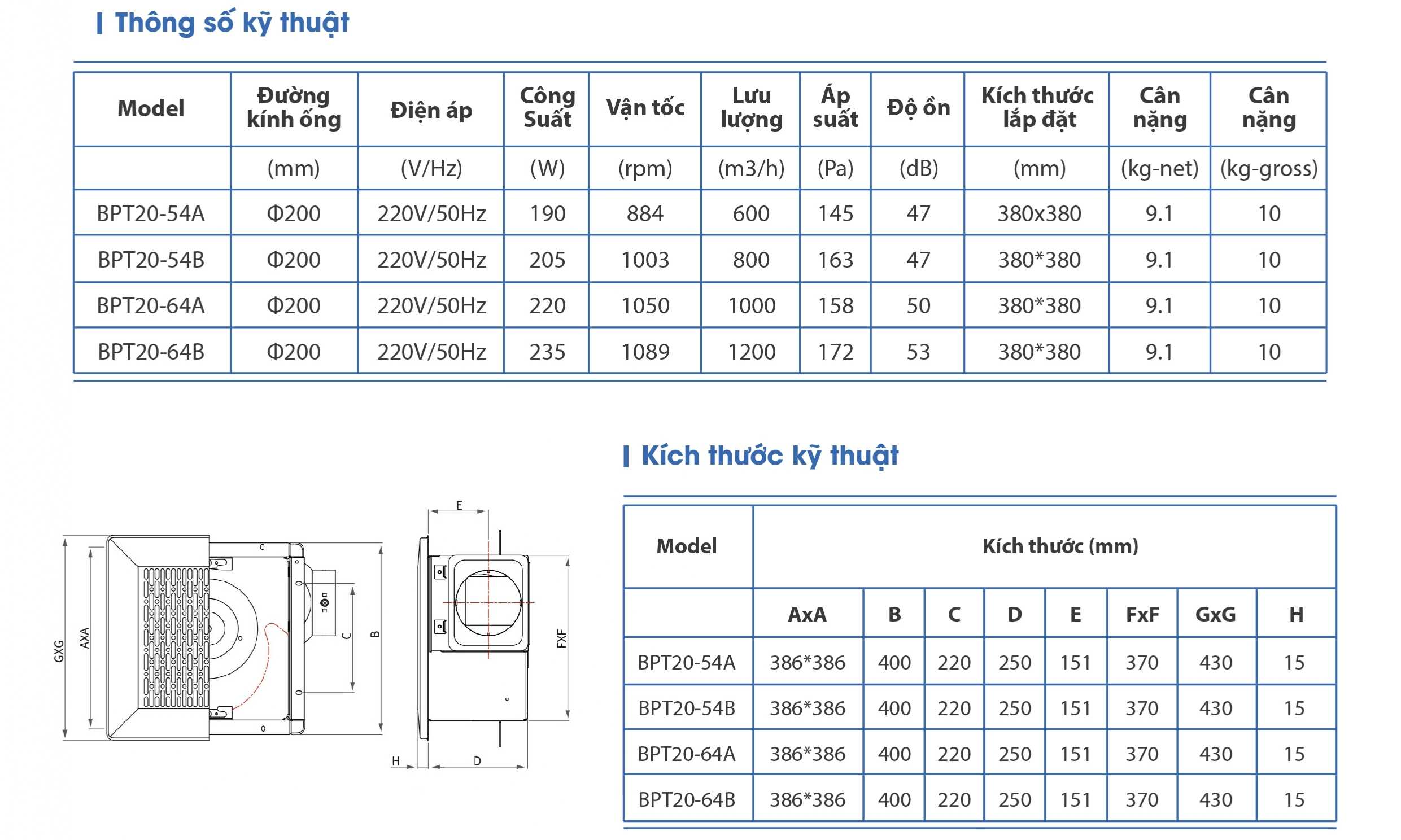 Thông số kỹ thuật quạt hút âm trần Nanyoo BPT20-54A
