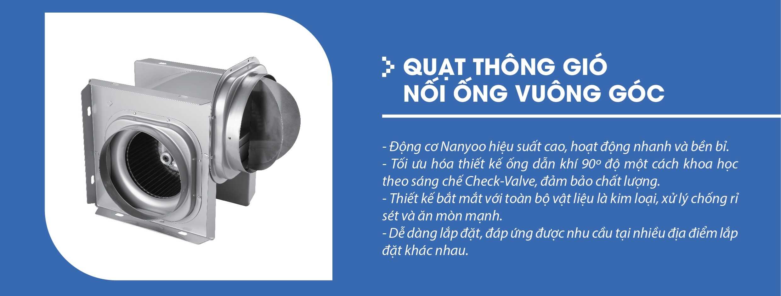 Quạt thông gió nối ống vuông góc Nanyoo DPT25-76 là loại quạt thông gió ly tâm chuyên dùng nối ống gió. Quạt có cấu tạo 2 đầu ống vuông góc với nhau phù hợp hút mùi, hút bếp, thông gió ở những vị trí cần lắp vuông góc.